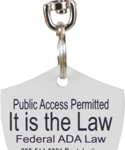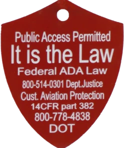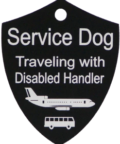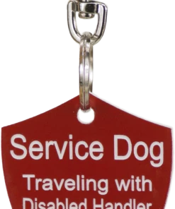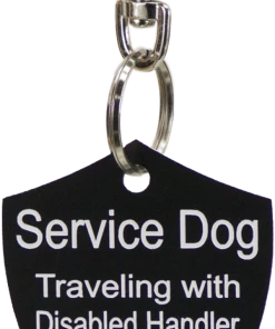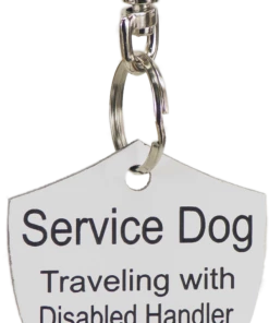 The Engraved Service Dog Travel Tags are perfect accessory when traveling with your service dog. The tags are a shield shape with engraving on both sides of the tag. The tag reads Service Dog Traveling with Disabled Handler on one side and ADA law on the other side. This tag come with a split ring and a easy to use chrome trigger snap, making this tag easy to attach or change locations if desired. The Engraved Service Dog Travel tag is approx 2″x2.5″ making it the perfect size to clip on any collar, vest, harness, or carrier. Made in USA