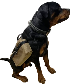 This is a sturdy wearing vest harness because of its two adjusting girth straps. The back girth strap is slightly shorter than the front because most dogs are narrower at the flank than the chest. The girth straps are set close enough together that they should not bother the movement of a male dog. Two adjusting girth straps will stabilize what is carried in the bags, when fitted properly. When loading the bag’s, it always works best for the dog to try to evenly weight the bags. Adjust the chest tight enough that the harness will sit just behind the dog’s front legs. This will put the weight towards the dog’s shoulders and not on its lower back. Girth strap measurements are: the front girth strap fits from 29” to 39” and the back girth strap fits from 28” to 36”.