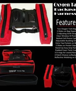 The bag size is approximately 5.5″ x 16″ & 6″ deep, this will accommodate a standard M9 or smaller portable oxygen cylinder (with regulator attached). On the top of the backpacks there is a stand-up easy grip handle, cell phone carrier, and a clear ID pocket. There are a total of three D-rings for attaching leashes or bridge handle. There are two girth straps so the tanks don’t flop around, they are adjustable. The front chest strap is adjustable and has a buckle. Both sides have safety reflective webbing on them.