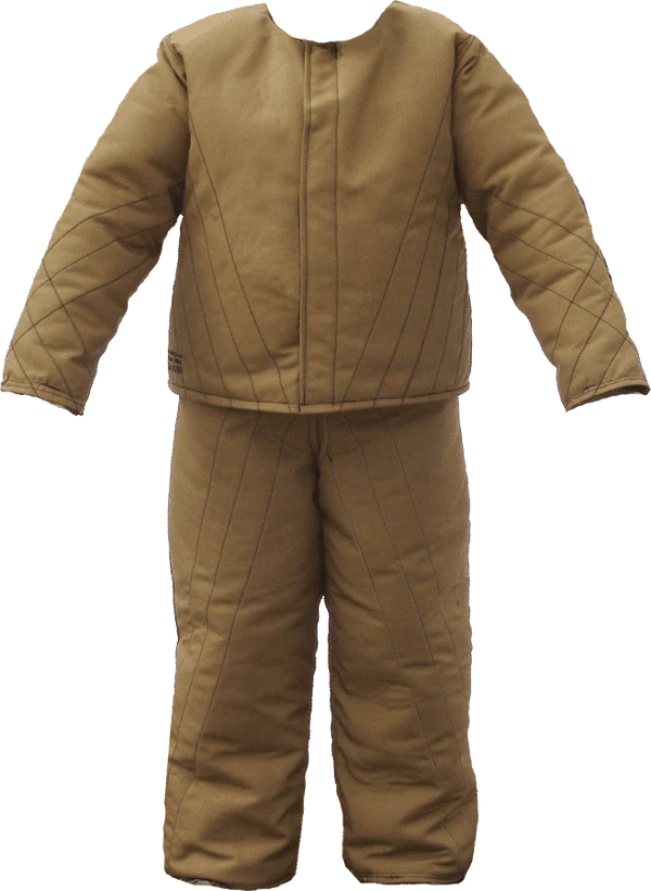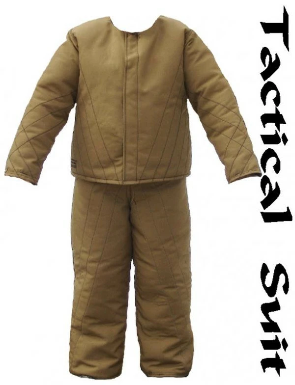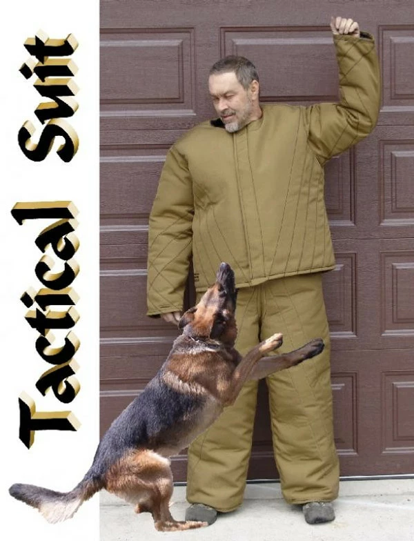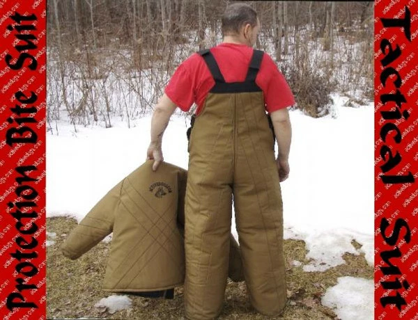 The purpose of the Tactical Bite Suit is to be a layer of protection worn under the decoys clothing. The suit is low profile and more form fitting & flexible than a regular bite suit, making it more suitable to be worn under clothing. This suit is for an experienced decoy handler. When working protection biting dogs the decoy will get a realistic feel for how much pressure the dog is biting with. This is a good suit when training the protection dog to advance on the criminal and not be looking for the bite training equipment. The Tactical Bite Suit is constructed of ballistic materials on the exterior with dense but thin padded interior protection. It is quilted, lined and double stitched throughout. The neck has a low profile neckline. There is wide hook & loop tape down the entire front closure. The pants stay on and in place as they are constructed in a bib style. The shoulder straps of the jacket and the waist of the bib pants are adjustable for a personal fit. This suit comes in 3 sizes and colors may vary.