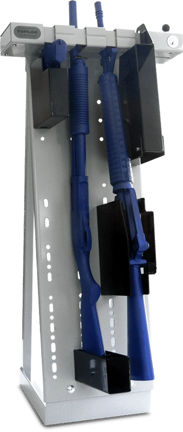 The Quad Racks are customizable with different pockets for different type of weapons. They can hold anything from a shotgun to an M16 to a pistol. There are also pockets for storing ammo and accessories. They can be free standing with the standard or long stand; otherwise they can be bolted onto the wall. Pocket sold separately. Standard Stand used with 4 Guns (Standard Back Plate) and the Long Stand used with 4 Guns (Long Back Plate)