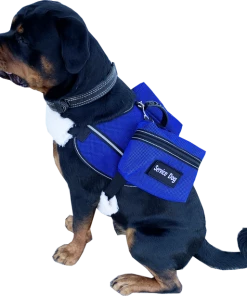 On the top back section of this vest is a vinyl window pocket to put your dog’s ID Badge with velcro closure to secure it in place. This window pocket will fit all ID Badges made by ActiveDogs. The rubber molded handle is placed vertical for comfort and easy access. There are 4 reflective strips on the vest and the entire vest and additional bags are bound in reflective webbing for maximum visibility & safety. There are 4 D-Rings on this vest to accommodate your bags, bridge handles, leash & other accessories. The girth and chest straps are 1.5” in width and come with padded removable sherpa covers, both are adjustable to get the best fit.