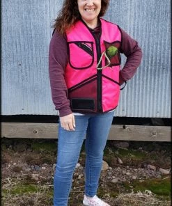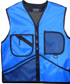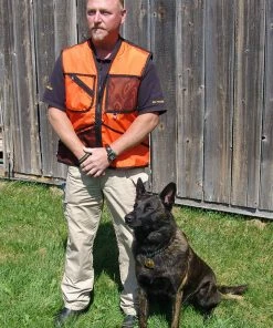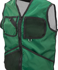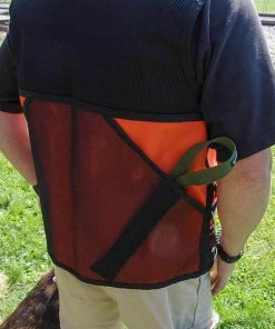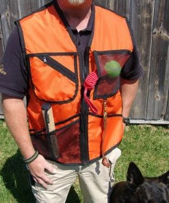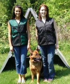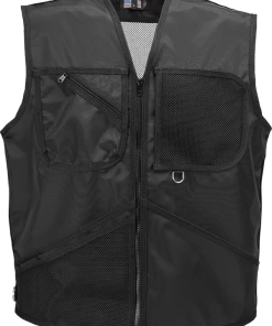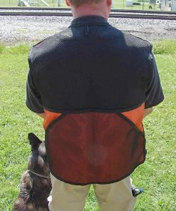 The Handler Training Vest that is made in the USA and is of the highest standard of workmanship. There is not a raw seam on this vest. All seams are double stitched and bound for durability and comfort. The neck is a comfortable open V style. The back top of this vest is made of strong mesh for ventilation in warm weather training. The back large pouch pocket is also made of a layer of mesh that is lined for stability. On the side there is a D-ring to hook your leash when not in use and another D-ring on the top front under the ball pocket. The front has three large bottom pockets, one being mesh. On the top there is a pocket that opens at the side for quick access of your motivation ball or tug. The other front top pocket zips closed so you can keep items secure. The zipper is molded so no rusting. The arm holes are large enough to be comfortable. USA MADE