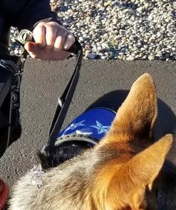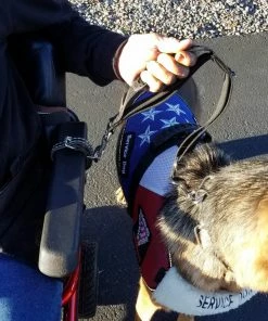 Like the wheelchair pulling lead that was created out of the need to have a leash that could be used in conjunction with pulling a wheelchair. The lead needed to be sturdy but at the same time it was necessary for the lead to be flexible. So we used a very heavy weight flat bungee material that is used in horse equipment, so you know it is strong for this application. Our original bungee lead was too cumbersome to attach to many wheelchairs but this flat lead with a full loop, not only makes this pulling lead double strong but you, can loop it through nearly any wheelchair. That is why the design of the large looped handle. It has enough stretch to give the dog room for movement while starting to pull the chair. This amount of stretch is perfect as it gives the dog just enough room to go ahead or behind the wheelchair while getting through a doorway. Doorways are the problem when a dog is used to help pull a wheelchair. We train our ADASDF service dogs to go behind the chair and then when the chair gets through the doorway, the person in the chair stops, if necessary hold the chair brake, and then have the dog come up beside the chair. Eventually the dog will know when it comes to a doorway it falls back behind the chair until the handler gets through the door and then speeds up its pace to get back beside the chair. To train a dog to pull a wheelchair with this lead you first need to train the dog to pull the chair on a flat surface so the dog will get a feel for the stretch in the lead and know just how far it has to move to make the chair move with it. We use the word pull and make it sound three different ways while saying it. By saying it slow “puuulll” the dog learns to walk slowly beside the chair, saying it “pull” we use this for normal walking speed. And if we need the dog to move fast beside the chair we say “Pll” quickly. This signals the dog to walk fast. It is not really complicated if you are always consistent in how you use the word. Just a note: It is important to teach the word “STOP” during regular obedience training as you will need this when the dog learns to pull the wheelchair.