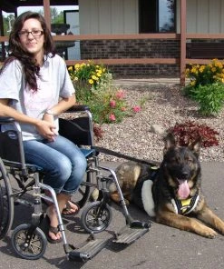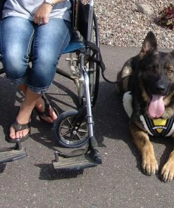 We train our ADASDF service dogs to go behind the chair and then when the chair gets through the doorway, the person in the chair stops, if necessary hold the chair brake, and then have the dog come up beside the chair. Eventually the dog will know when it comes to a doorway it falls back behind the chair until the handler gets through the door and then speeds up its pace to get back beside the chair. To train a dog to pull a wheelchair with this lead you first need to train the dog to pull the chair on a flat surface so the dog will get a feel for the stretch in the lead and know just how far it has to move to make the chair move with it. We use the word pull and make it sound three different ways while saying it. By saying it slow “puuulll” the dog learns to walk slowly beside the chair, saying it “pull” we use this for normal walking speed. And if we need the dog to move fast beside the chair we say “Pll” quickly. This signals the dog to walk fast. It is not really complicated if you are always consistent in how you use the word. Just a note: It is important to teach the word “STOP” during regular obedience training as you will need this when the dog learns to pull the wheelchair.