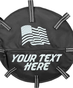 It is made from water resistant strong black ballistic materials. This material wipes clean with damp towel. It quickly and securely attaches to the wheelchair tire with eight reflective hook and loop straps. This bag has a center zipper with a large easily accessible long zipper tab. The text on the Wheelchair Spoke Guard Bag is done with reflective vinyl. This is a great safety feature for early morning and evening hours of travel.